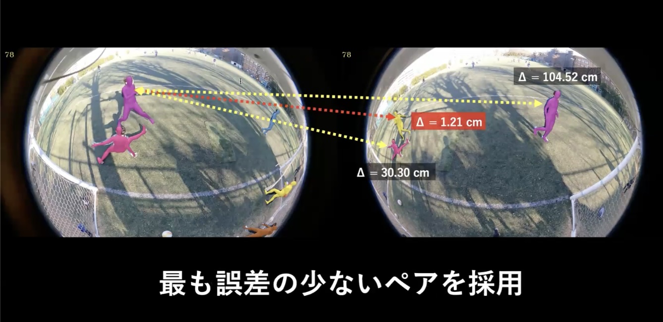 また、練習中の分析を行う際に解決すべきもう一つの課題として、動画に複数人が映っている場合への対応があります。撮影した動画には、プレー中のゴールキーパーだけではなく他の選手も同時に映り込んでいることがほとんどです。この場合、左右のカメラで写っている選手が異なるという問題が発生する中で、左右の動画に映っているどの人とどの人が同じ人なのかをマッチングさせる必要があります。我々はこのような状況下でも正しく3DCGを生成するための仕組みを開発しました。