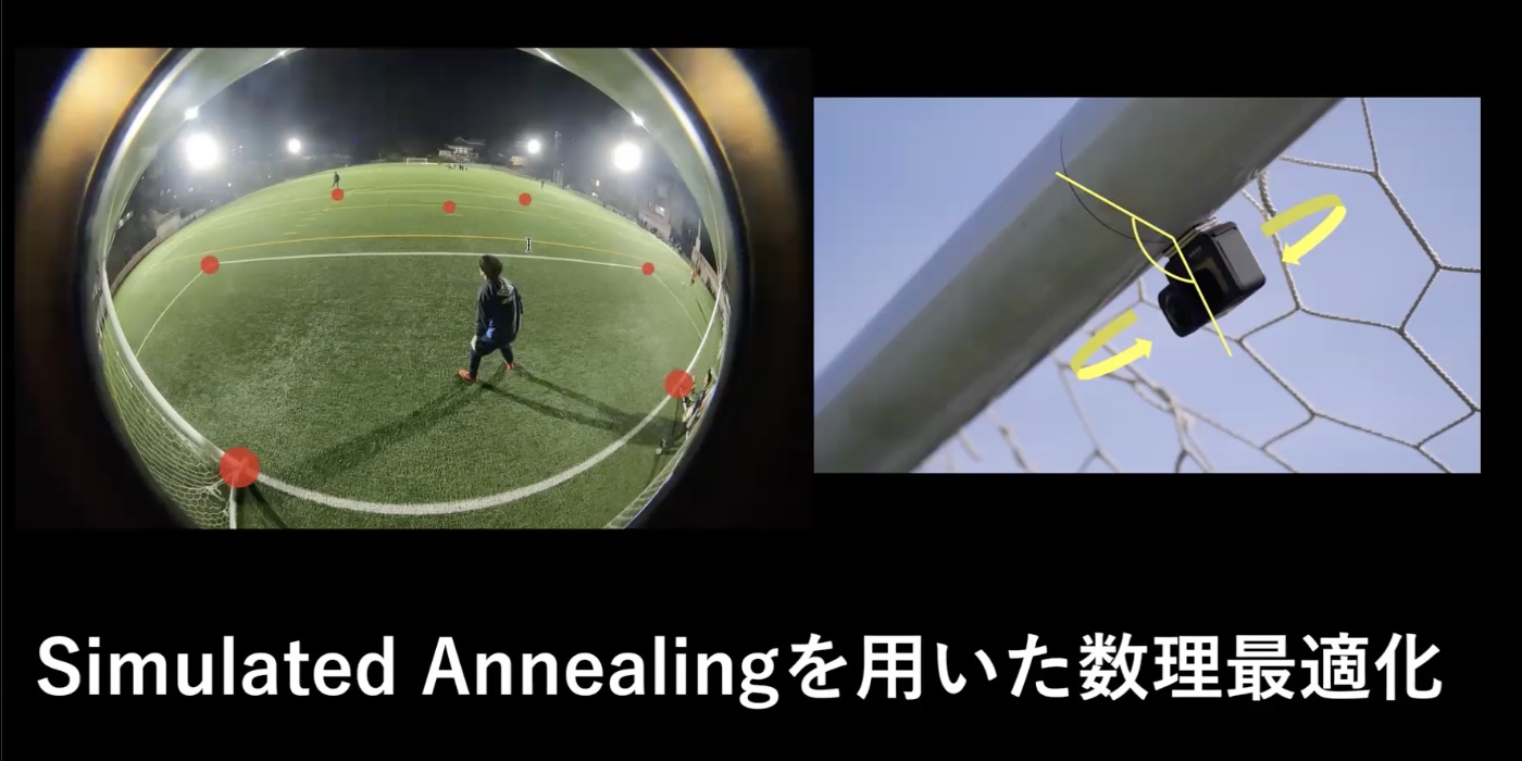 ゴールにカメラを設置した際に、フィールド上にはゴールやペナルティーエリアの角など、カメラからの相対位置が常に一定になっているような点がいくつか存在します。カメラを設置したときにこれらの参照点の情報を用いて数理最適化を行い、データからカメラの角度を推定します。これによって毎回の練習における正確な測定を可能にしています。