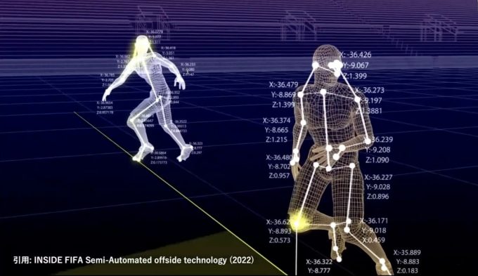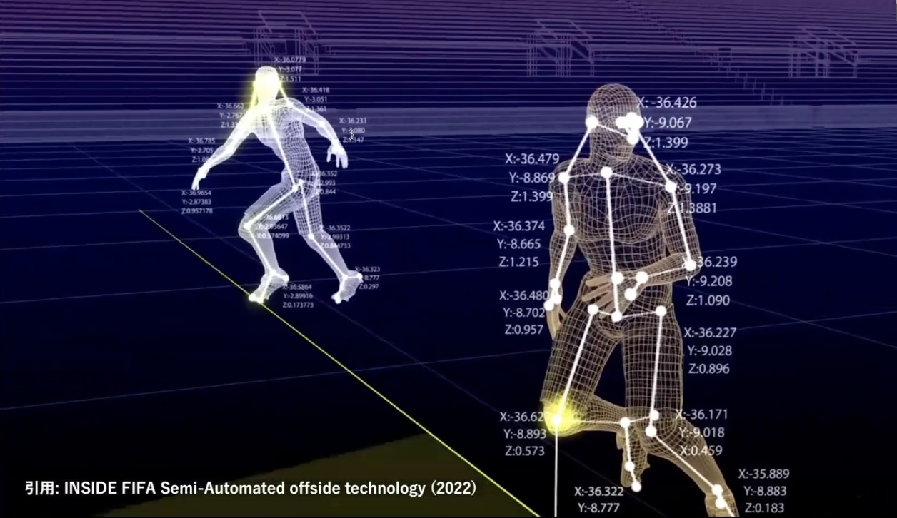 サッカーにおいて、3次元トラッキング自体は新しい技術ではありません。例えばカタール・ワールドカップでは、スタジアムにたくさんのカメラを取り付け、選手の骨格を取得することで、半自動的にオフサイドの判定を可能にしていました(上図)。しかしながら、これらの3Dトラッキングはワールドカップなど大きな大会のデータしか取れません。