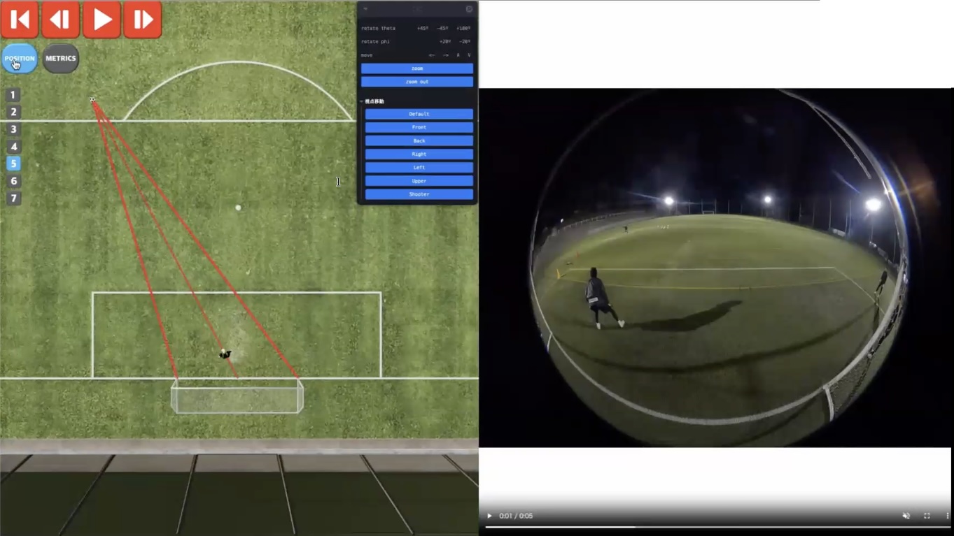SMART GOALを使えば、後方からのプレー映像が正確にCG化されます。また、ボタンを使って自由に視点を移動することができ、ライン(線)を使ってポジションも視覚的に確認できます。またゴール前のフィールドプレーヤーもとらえているので、プレーの文脈を含めた振り返り、そしてシュートを打った選手からの視点もチェックすることができます。