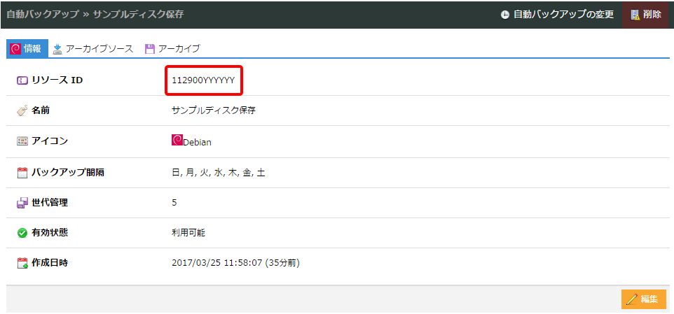 自動バックアップの詳細ページ→[情報]タブで、右下の[編集]をクリックします。