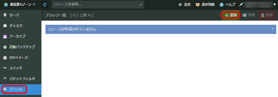 左側のメニューで「ブリッジ接続」を選択します。この画面では作成済みのブリッジの一覧が表示されます。新規に作成する場合は右上の「追加」ボタンをクリックします。