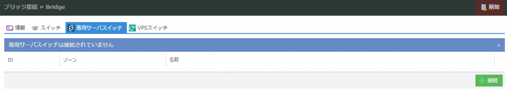 スイッチの詳細画面が表示されるので、上部の「ブリッジ」タブをクリックしてブリッジ接続リスト画面を開きます。ここでは新たにブリッジを接続するので右下の「接続」ボタンをクリックします。
