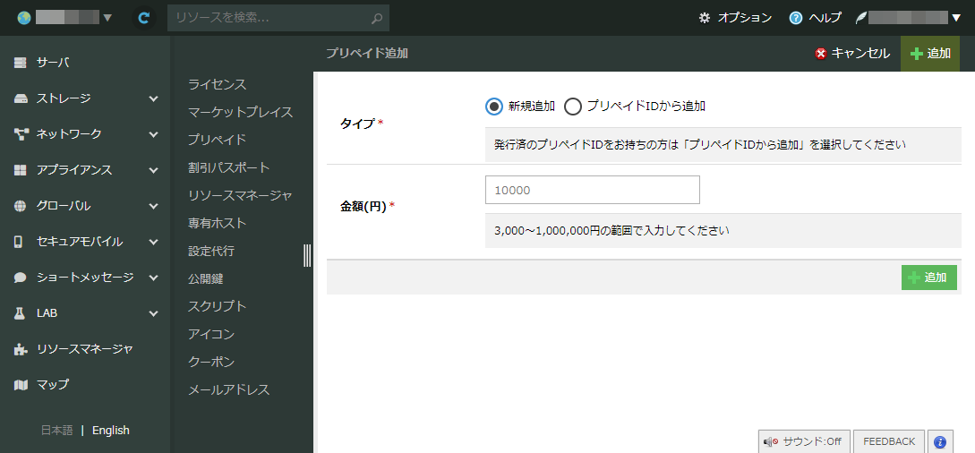 | タイプ | ・新規追加: 新たにプリペイドをお申込みします ・プリペイドIDから追加: 発行されたプリペイドIDを有効化します(お問い合わせフォームからお申し込みしたプリペイドの プリペイドID登録 を行う場合に選択します) |