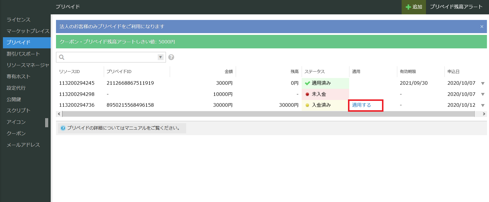 弊社側での入金確認が完了しプリペイドIDが利用可能な状態になると、お申し込みした該当のプリペイドのステータス欄が「入金済み」の表示となり、「適用する」のリンクが表示されます。ここをクリックしていただくことで登録が行われます。