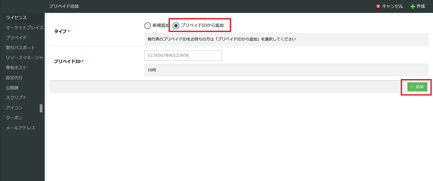 コントロールパネルの プリペイド新規追加画面 の「タイプ」の項目で「プリペイドIDから追加」を選択し、表示された「プリペイドID」入力フォームにプリペイドIDを入力し「追加」ボタンをクリックします。
