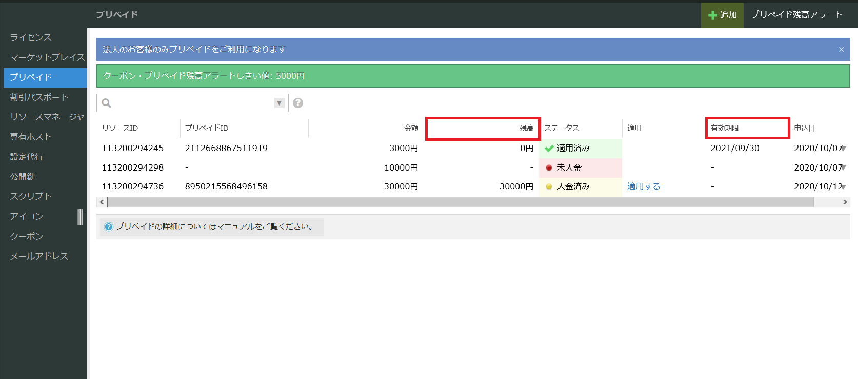 入力後「追加」ボタンをクリックするとお申し込みが完了し、プリペイド一覧画面にお申し込みしたプリペイドの情報が表示されます。