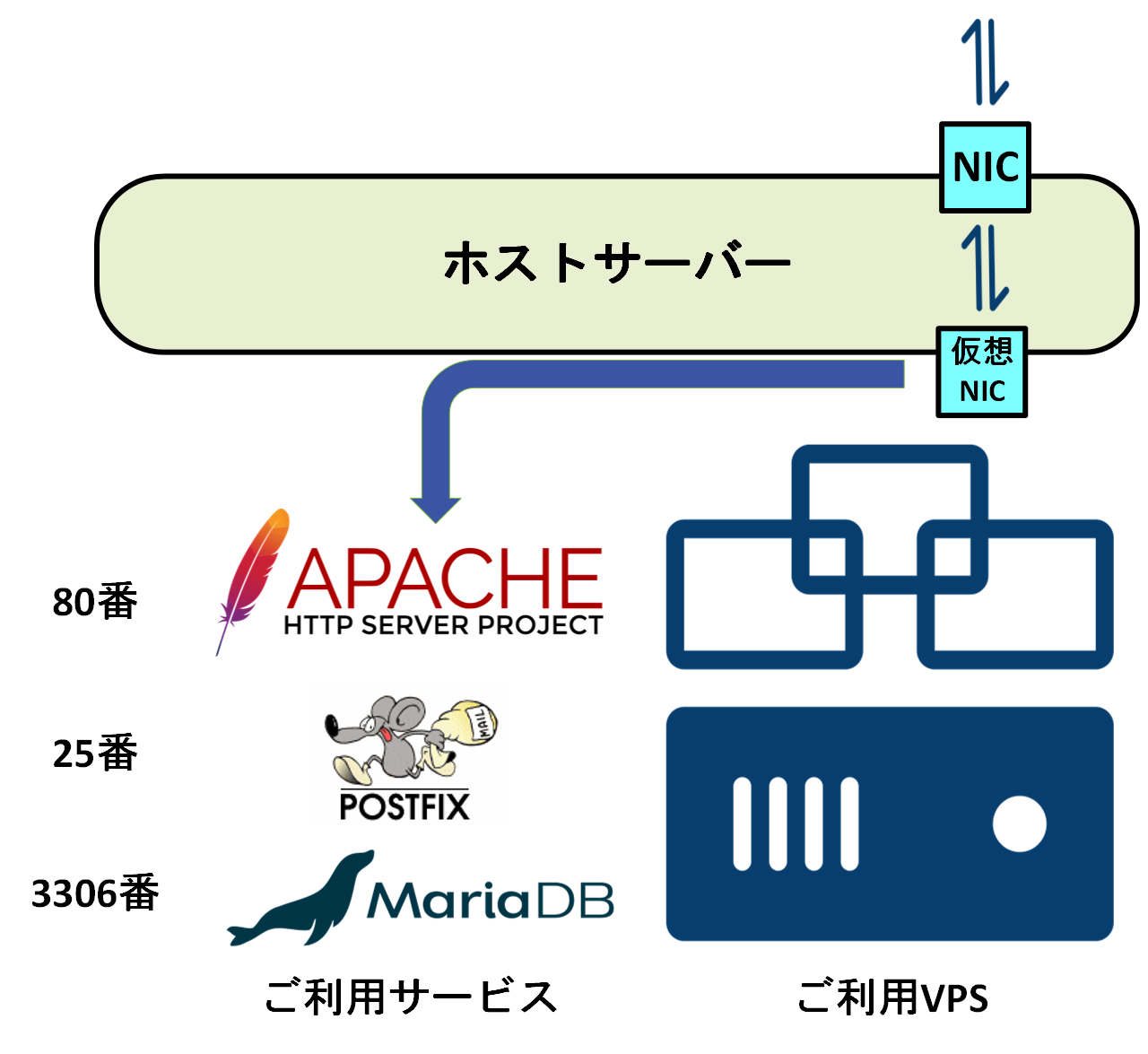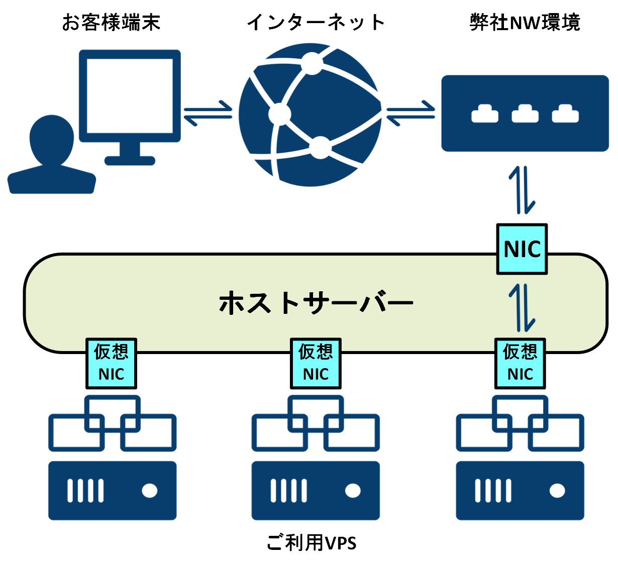 このイメージのように、弊社ネットワーク環境へ到達した通信は、ホストサーバーのNICを通ってスイッチングされ、ご利用VPSの仮想NICへ到達します。