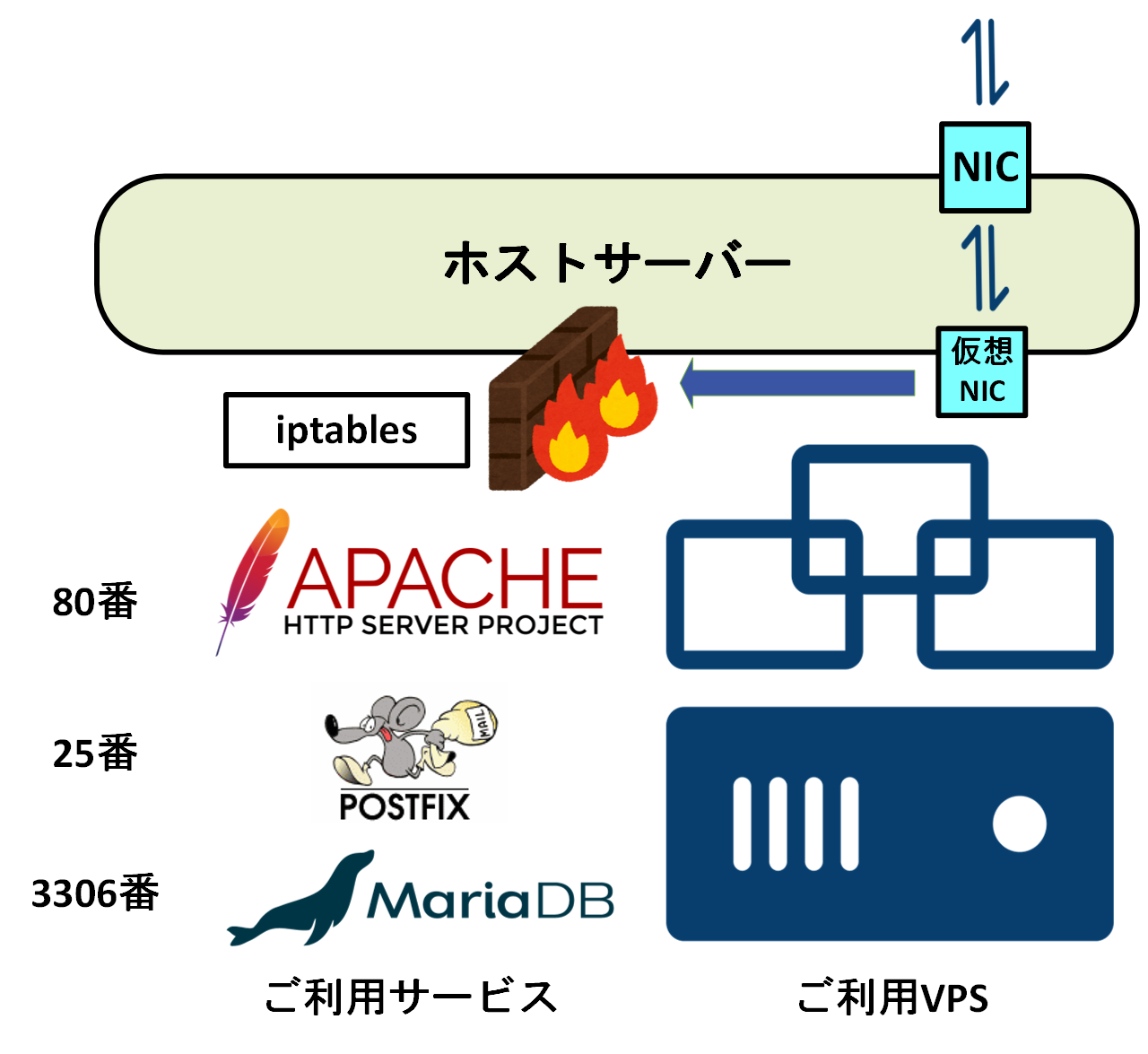 ご利用VPSの仮想NICに到達したトラフィックは宛先ポートに対して通信を実施し、そのポートをリッスンしているサービスが応答を返す、という流れになっています。