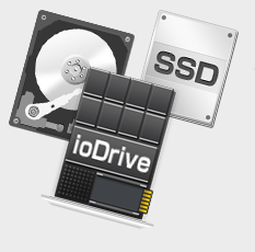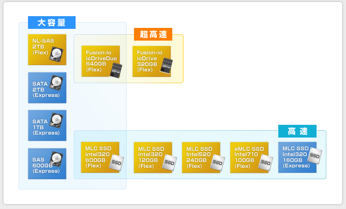 フレックスシリーズではFusion-ioのioDriveが利用可能。圧倒的な速さでI/Oのボトルネックを解消し、データベースサーバの集約を可能にします。大容量HDD、高速SSD、超高速ioDriveの幅広い内蔵ストレージラインアップから用途に合わせて自在なスケールアップが選択可能です。