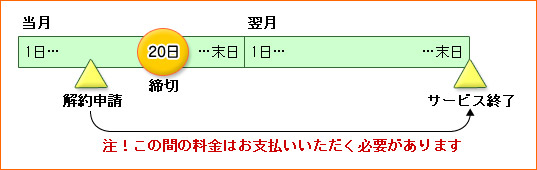 ご契約サービスの解約申請は、毎月20日に締め切り、翌月末日をもちまして サービスの終了とさせていただきます。(年間一括払いの一部を除く)