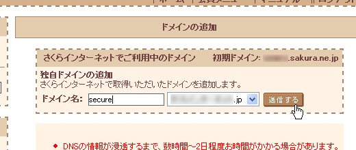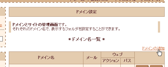 まずはドメインを追加します。以前のサーバにおいて、secure.example.jpなどのドメインで運用していた場合、同じ名称のドメインを追加する必要があります。「ドメイン設定」を選択し、CSR作成時に入力したものと同じドメイン名を追加します。