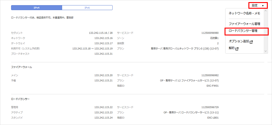ロードバランサーの管理ツールにログインするために必要なIPアドレスは「管理接続用IPアドレス」になります。