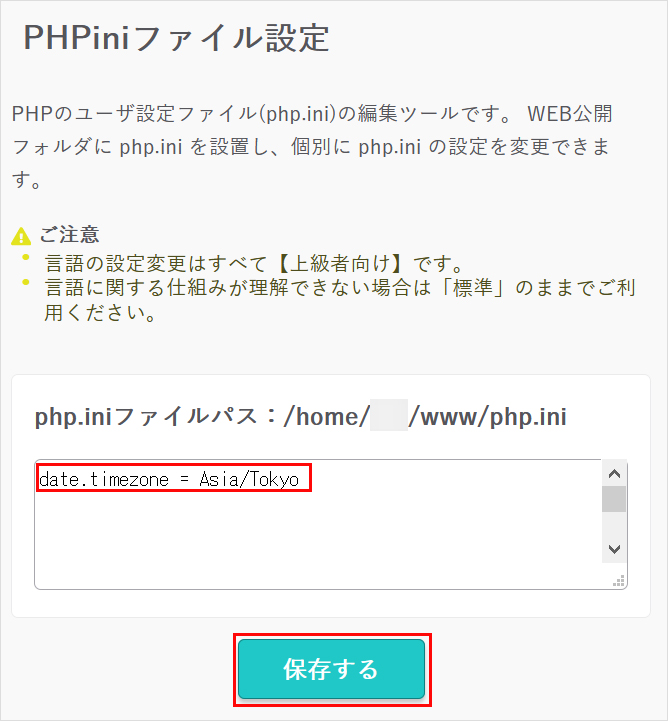 『date.timezone = Asia/Tokyo』と入力し『保存する 』をクリックします。