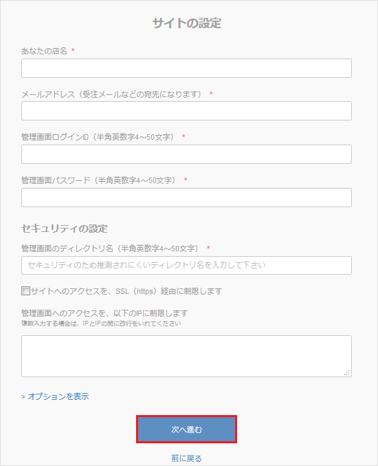 入力を省略されますと「EC-CUBEの詳細設定」へ進めなくなります。