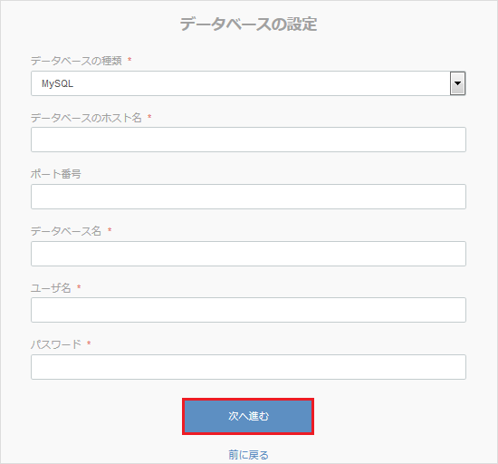 | データベースパスワード | データベースの作成時に設定したパスワードを入力します。 ※[作成したデータベースがある場合]でデータベースを作成された場合は、設定済みのデータベースパスワードを入力します。 |