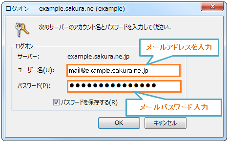 例)mail@example.sakura.ne.jpパスワード 設定する(利用する)メールアドレスのパスワードを入力します。