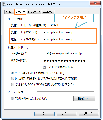 受信メール(POP3) 初期ドメイン または 独自ドメイン(サブドメイン) または さくらのサブドメイン 送信メール(SMTP) 初期ドメイン または 独自ドメイン(サブドメイン) または さくらのサブドメイン 確認いただきたい項目