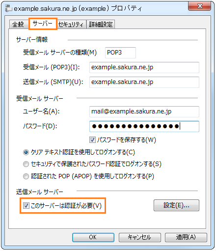 2「サーバー」のタブをクリックし、「このサーバーは認証が必要」にチェックが入っているか確認します。