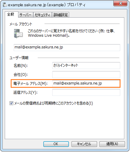 | ユーザー名 | 設定する(利用する)メールアドレスを入力します。 例)mail@example.sakura.ne.jp |