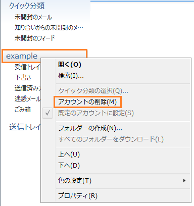 ※メールアカウントを削除した場合、受信していたメールが消える可能性がございます。1左側に表示されている「アカウント名」の上で右クリックします。
