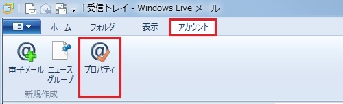 入力された受信・送信メールサーバー欄を確認してください。1『 アカウント 』から『 プロパティ 』をクリックします。