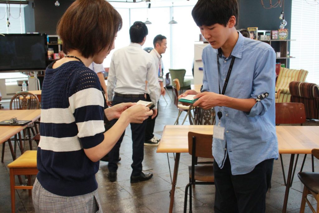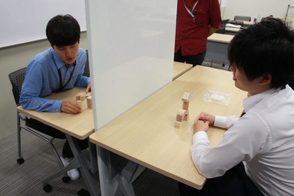 続いてビジネスマナー研修では当社社員を相手に名刺交換の練習。そして息抜き&ヒアリングのコツ習得のため、相手の積み木がどう組まれているかを見えない状態でヒアリングをし、同じように積み木を組む積み木ワークを実施。