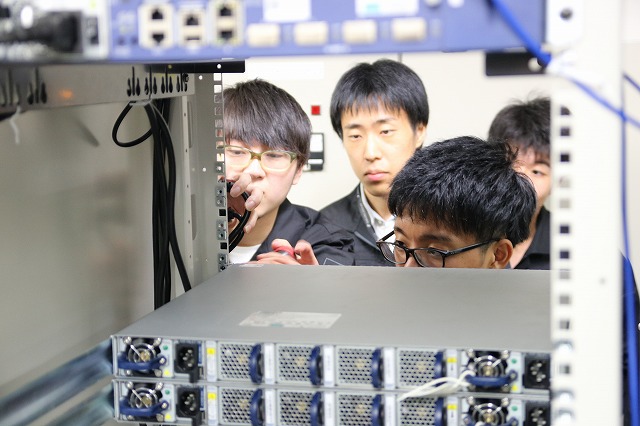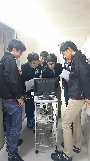 この時点では、サーバーはネットワークにつながっていません。これではせっかく仮想環境を作っても外部から操作できないので、まずはサーバーをネットワークに繋げましょう!そのためには配線をしたり、スイッチという機械を設定したりする必要があります。講義を終えた私たちは、この設定を行うべく、サーバールームへ向かいました。