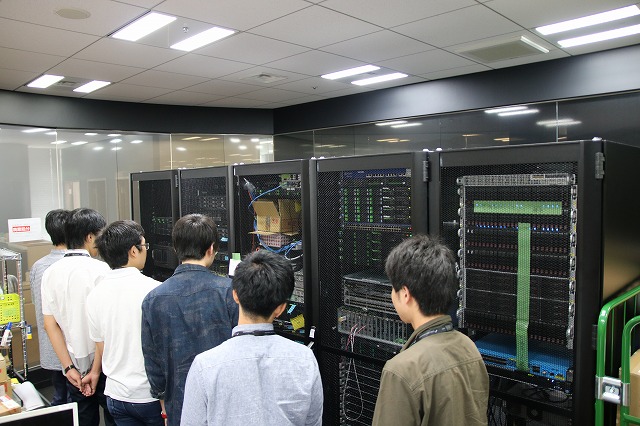 まず東京支社を見学させていただきました。画像は社内検証用サーバーラックです。一部のサーバーに養生テープで注意書きが貼ってあるところが印象的です。会社の雰囲気の良さが印象に残っています。