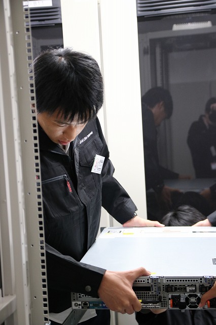 実習では、データセンター内でのハードウェアの交換を行いました。作業は、障害機をラックから取り出す→ストレージを交換機に移し替える→交換機をラックに戻す、といった手順で行います。