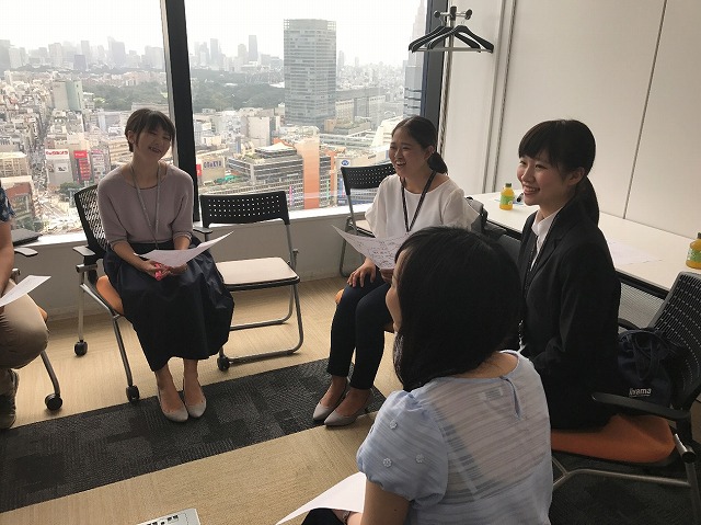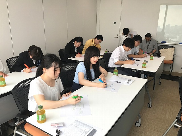 次に、社員の方々を交えた「マトリクス自己紹介」とインターンシップの決意表明を行いました。「マトリクス自己紹介」は、自分の関心のあるものを結び付けて発表するというもので、通常の自己紹介よりも多くの情報が得られ、会話が弾む非常に楽しいものでした。
