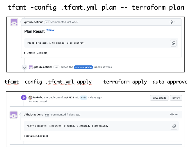 Pull Requestを送ると、上図のようにterraform planが走り、tfcmtがそれを受け取って、GitHubコメントとしてその結果を出してくれます。実行結果には「Details(Click me)」という項目が表示されており、これをクリックするとterraform planの詳細が出るようになっています。一方、applyの方はマージしたときに動くようになっていて、これも「Details(Click me)」をクリックすると詳細が出るようになっています。