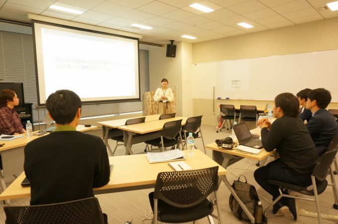 ライトニングトーク(以後、LT)会では「自分が印象に残った接客エピソード」を考えてくるという事前課題があり、それについて、1人2分程度でLTを行いました。