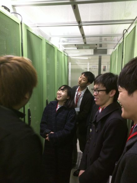 次にデータセンターの設備やサーバールームの見学を行いました。非常時にも常に施設を止めないようにする電源設備、それぞれ異なった排熱構造を持つ2つのサーバールームが実際に稼働している様子を解説を受けながら見学しました。