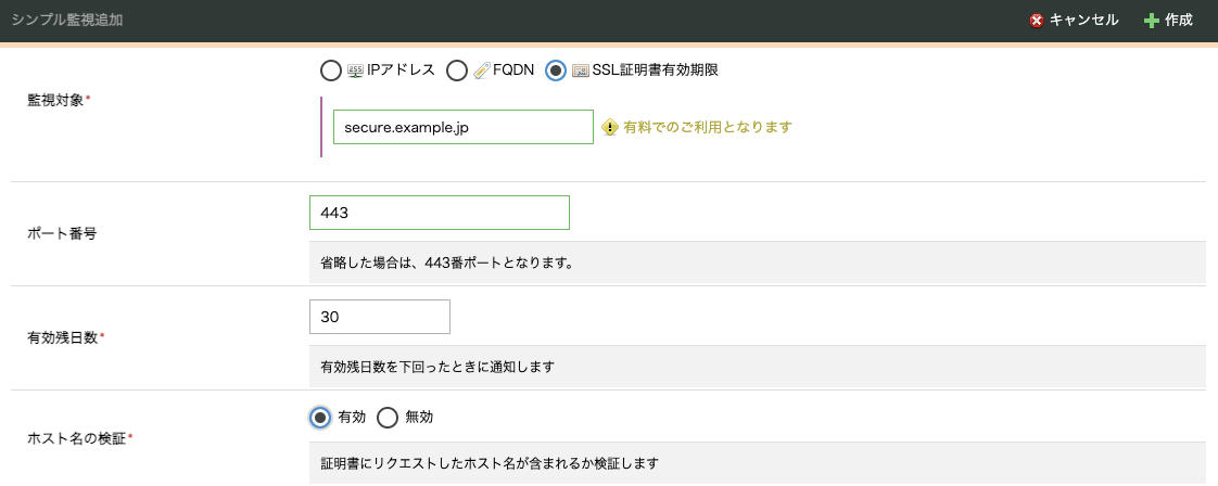 | ホスト名の検証(*) | 取得したSSL証明書にFQDNが含まれることを確認します ※SSL証明書有効期限監視の際に表示されます |