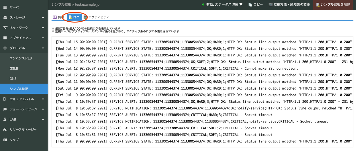 「ログ」タブにて、監視や通知を行った際のログを確認することができます。