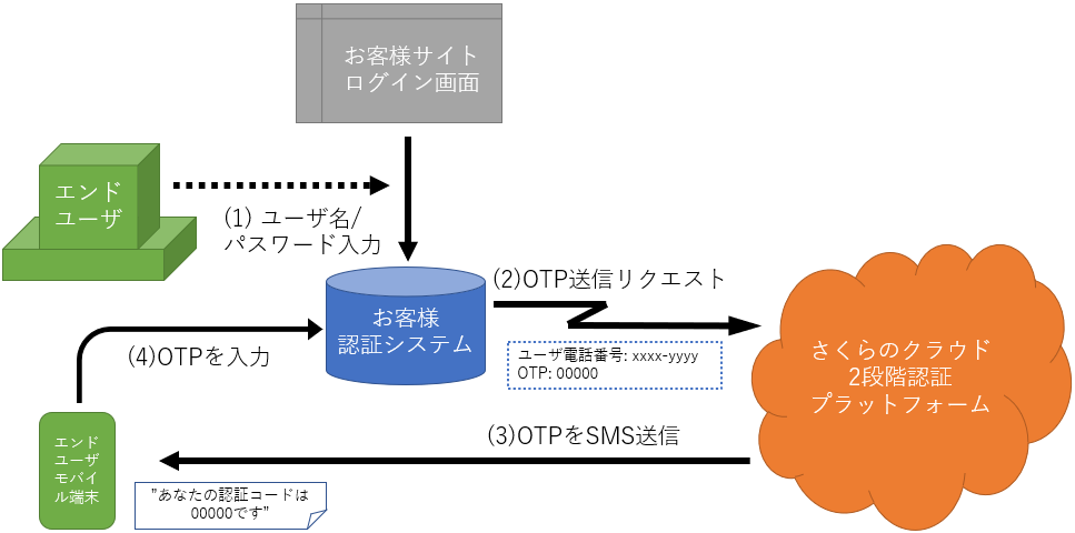 さくらのクラウドが提供する二要素認証プラットフォームでは、お客様システム上にSMS送信の仕組みを新たに構築することなく、既存の認証基盤に二要素認証によるより強固なセキュリティ機能を簡単に追加することができるサービスです。