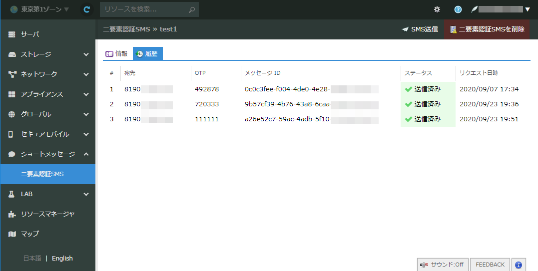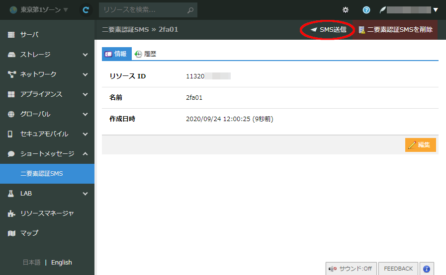 いずれかの二要素認証SMSのリソースを選択し、上部に表示される「SMS送信」ボタンをクリックします。