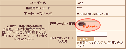 データベースの設定画面が表示されます。[ 管理ツールへ接続 ]の、phpMyAdmin アイコンをクリックします。